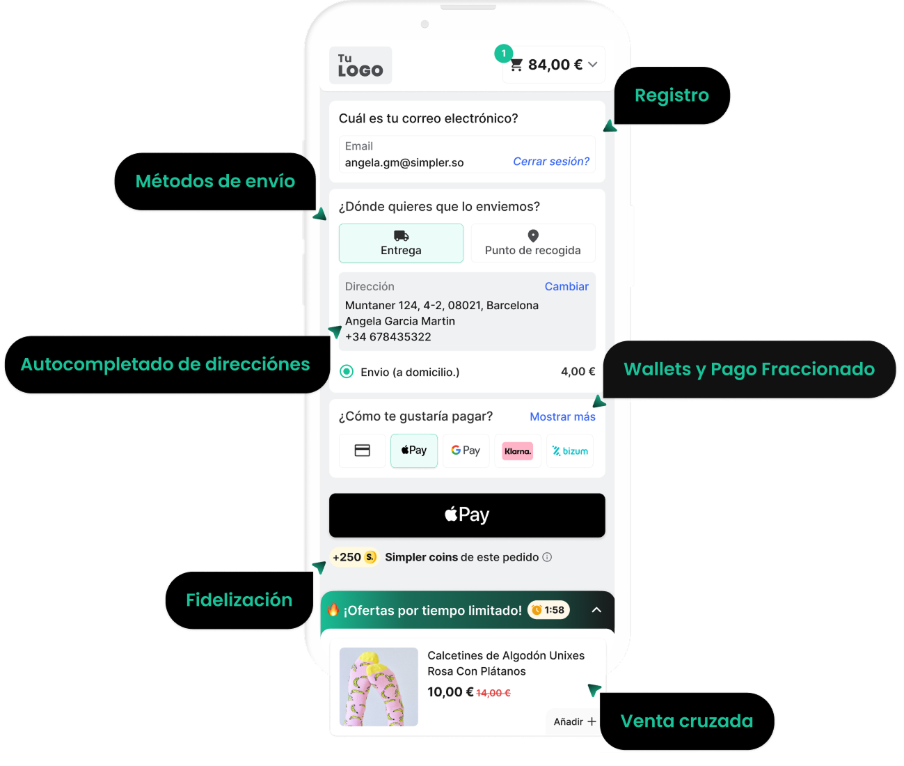 Más de un millón de compradores ya tienen una Simpler con Simpler . Cuando visitan tu tienda, los datos de pago ya están rellenados, el programa de fidelización está activo y pueden volver a comprar con un solo toque, sin necesidad de registrarse.