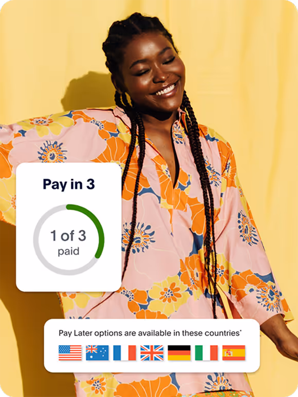 1 Pay in 3 availability is subject to merchant status and integration. Consumer eligibility is subject to status and approval. Pay in 31 is a form of credit, may not be suitable for everyone and use may affect consumer’s credit scores. See product terms for more details.